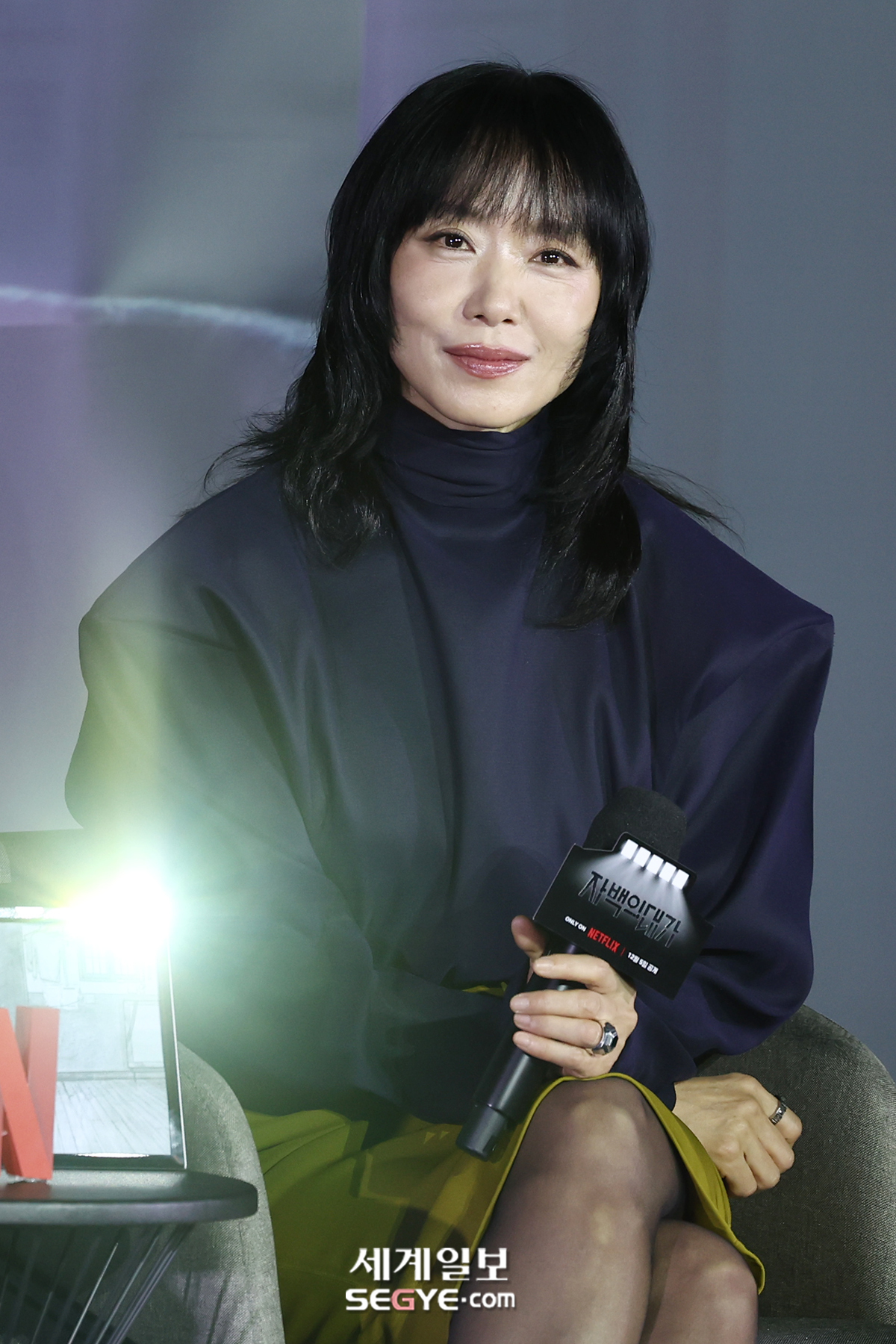 배우 전도연이 3일 용산 CGV에서 열린 넷플릭스 시리즈 ’자백의 대가’ 언론시사회에 참석해 취재진의 질문을 경청하고 있다.