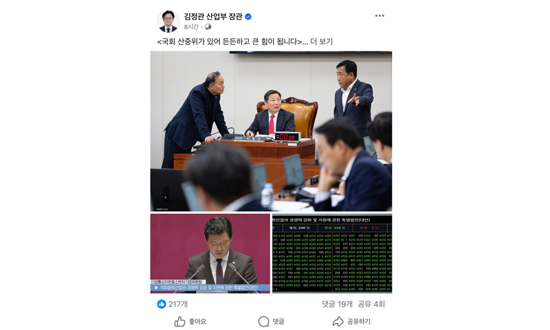 김 장관은 추미애 법사위원장을 비롯한 법사위 의원들, 우원식 국회의장과 표결에 참여한 국회의원 모두에게 깊이 감사한다고 밝히고, 문신학 산업부 차관과 산업부 직원들을 두고도 "법안 발의부터 통과까지 혼신의 힘을 다해줬다"며 감사하다는 인사를 전했다.