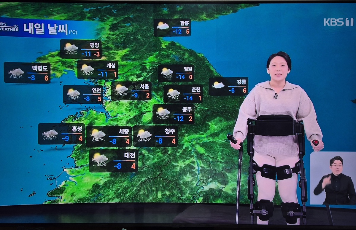 세계 장애인의 날인 지난 3일 전국장애인체육대회 댄스스포츠 1위 출신 국가대표 채수민씨가 ‘웨어러블(Wearable)’ 로봇의 도움을 받아 KBS 9시 뉴스 일일 기상캐스터로 등장했다.