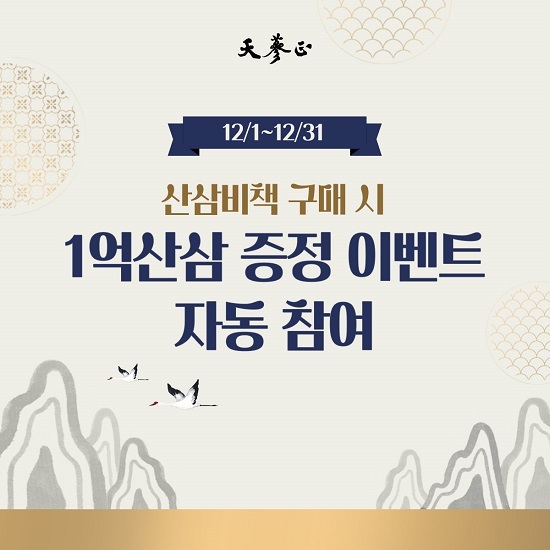 천삼정이 연말을 맞아 자사몰에서 산삼비책 구매 고객을 대상으로 1억 원 상당의 산삼 증정 이벤트를 진행한다. 이번 이벤트는 구매만으로 자동으로 응모가 완료되는 간편한 방식으로, 연말을 맞아 특별한 혜택을 제공하고자 마련됐다. 이벤트 기간은 12월 1일부터 31일까지이며, 온라인 구매 고객이면 누구나 참여할 수 있다. 또한 당첨자가 부담해야 할 제세공과금의 부담이 없기 때문에 많은 관심이 쏠리고 있다.