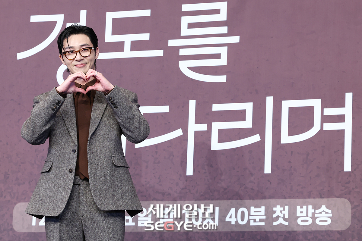 배우 박서준이 4일 서울 구로구 신도림동 더링크호텔 웨딩홀에서 열린 JTBC 토일드라마 ‘경도를 기다리며’의 제작발표회에 참석해 포즈를 취하고 있다.