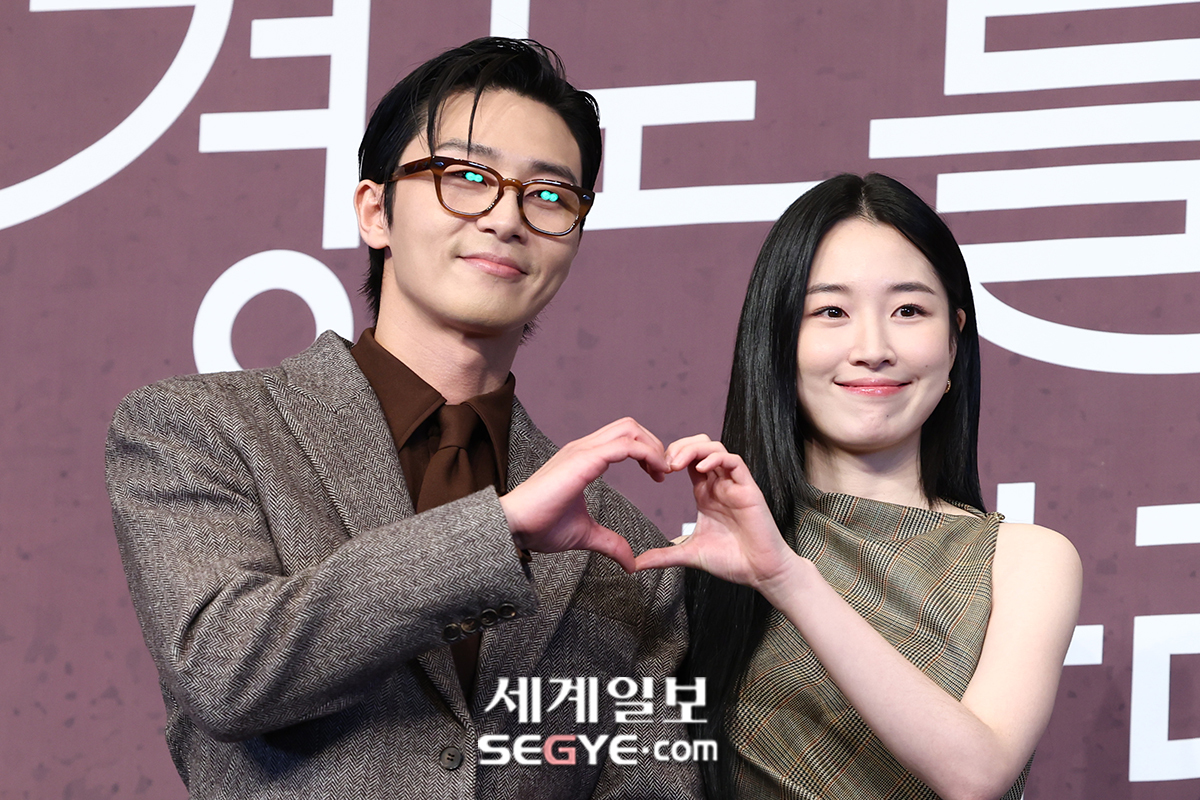 배우 박서준(사진 왼쪽)과 원지안이 4일 서울 구로구 신도림동 더링크호텔 웨딩홀에서 열린 JTBC 토일드라마 ‘경도를 기다리며’의 제작발표회에 참석해 포즈를 취하고 있다.