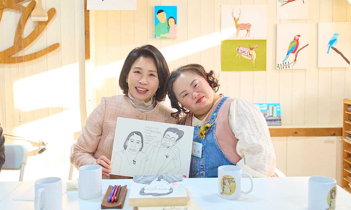 이재명 대통령의 부인 김혜경 여사(왼쪽)가 3일 경기도 양평 ‘어메이징 아웃사이더 아트센터’에서 열리고 있는 발달장애 작가 정은혜씨의 ‘은혜로운 명화전’을 찾아 정 작가의 작품을 들고 기념촬영을 하고 있다. 이번 방문은 발달장애인에 대한 인식 개선을 돕고 지역사회에서의 자립을 격려하려는 차원으로 알려졌다.