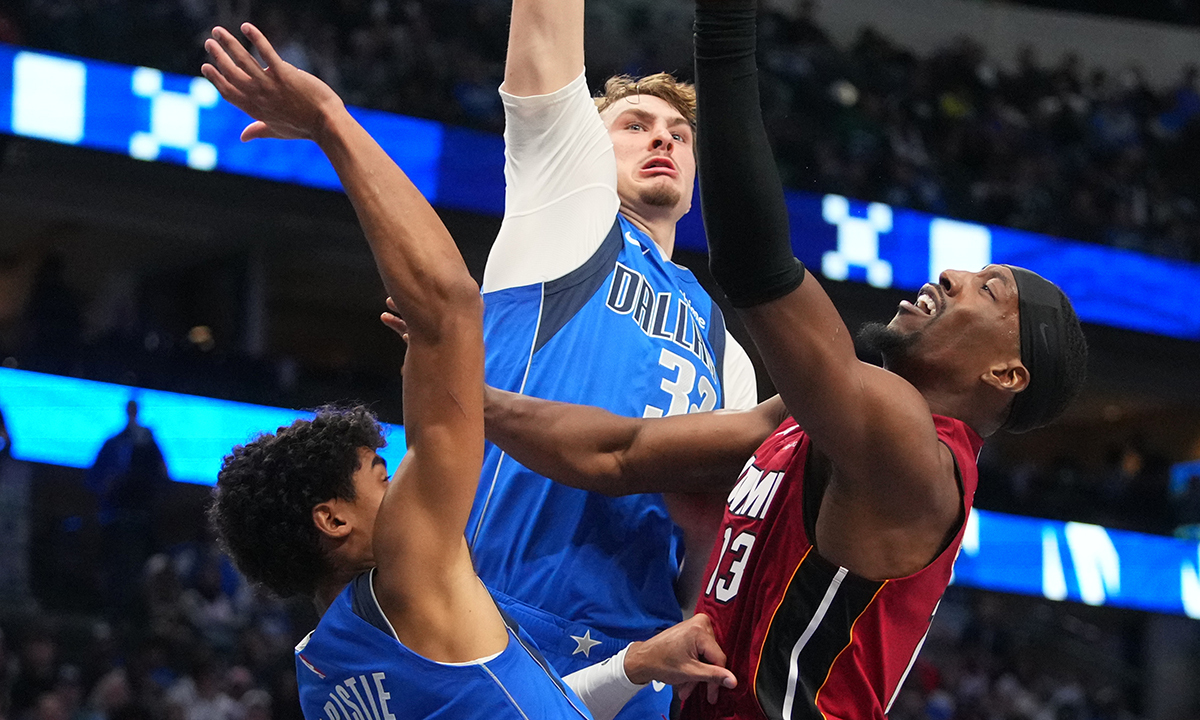 미국프로농구(NBA) 댈러스 매버릭스 신인 포워드 쿠퍼 플래그(가운데)가 4일 미국 텍사스주 댈러스 아메리칸 에어라인스 아레나에서 열린 마이애미 히트와 경기에서 상대 센터 뱀 아데바요의 골밑슛을 블록하기 위해 점프하고 있다. 이날 댈러스는 팀 내 최다인 22득점을 올린 플래그의 활약 속에 118-108로 마이애미를 꺾었다.