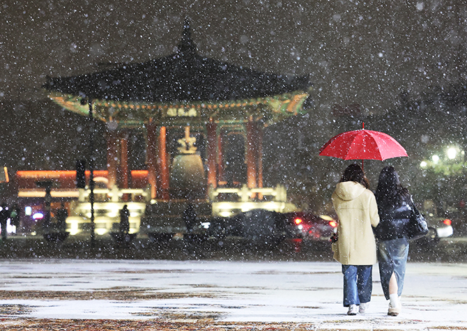 기상청에 따르면 이날 오후 9시까지 눈이 내릴 전망이다. 예상 적설량은 경기 북동부를 제외한 서울과 인천, 경기에 2~6㎝, 경기북동부와 강원북부내륙·산지에 3~8㎝다.
