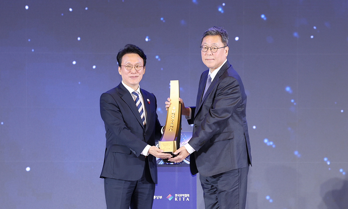 이규복 현대글로비스 대표이사(오른쪽)가 4일 서울 강남구 코엑스에서 열린 제62회 무역의날 기념식에서 김민석 국무총리로부터 60억달러 ‘수출의 탑’을 받고 있다. 현대글로비스는 지난해 59억달러에 이어 올해 61억달러 수출 실적을 달성했다.