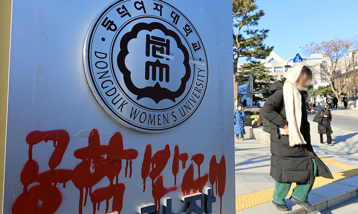 4일 서울 성북구 동덕여자대학교에 공학 전환 반대 관련 래커칠이 남아있는 모습. 뉴스1