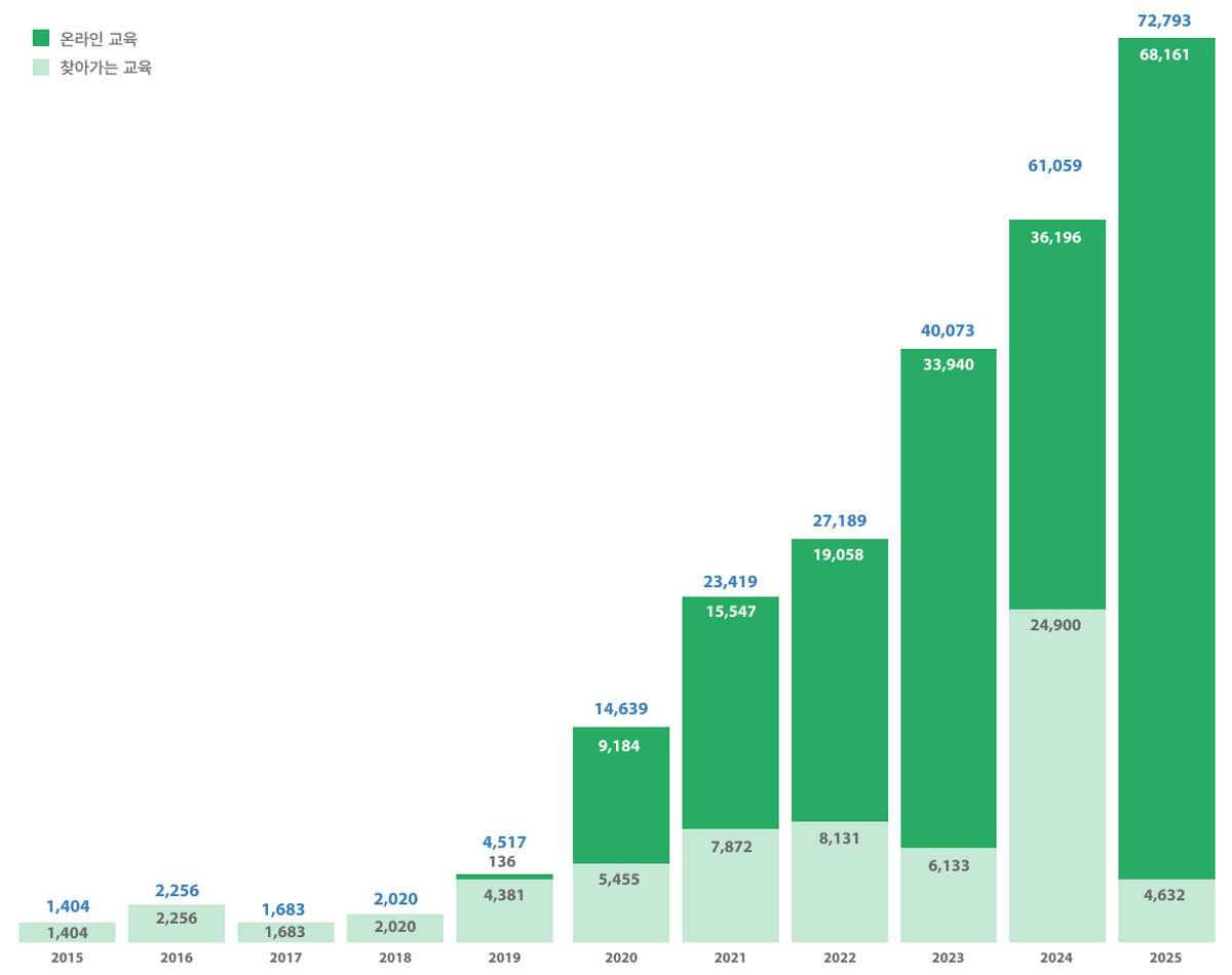 2015년부터 10년간 총 25만1088명의 예술인이 권리보호 교육을 수료했으며, 특히 2025년 한 해에만 7만2793명(11월 3주 기준)이 참여해 역대 가장 많은 인원이 교육을 받았다. 누적 기준으로 온라인 동영상 교육 18만2221명, 찾아가는 교육 및 주제특화 교육은 6만8867명(1162회 개최)이 수료해, 예술계 전반에서 권리보호 교육이 확산되고 있음을 확인할 수 있다.