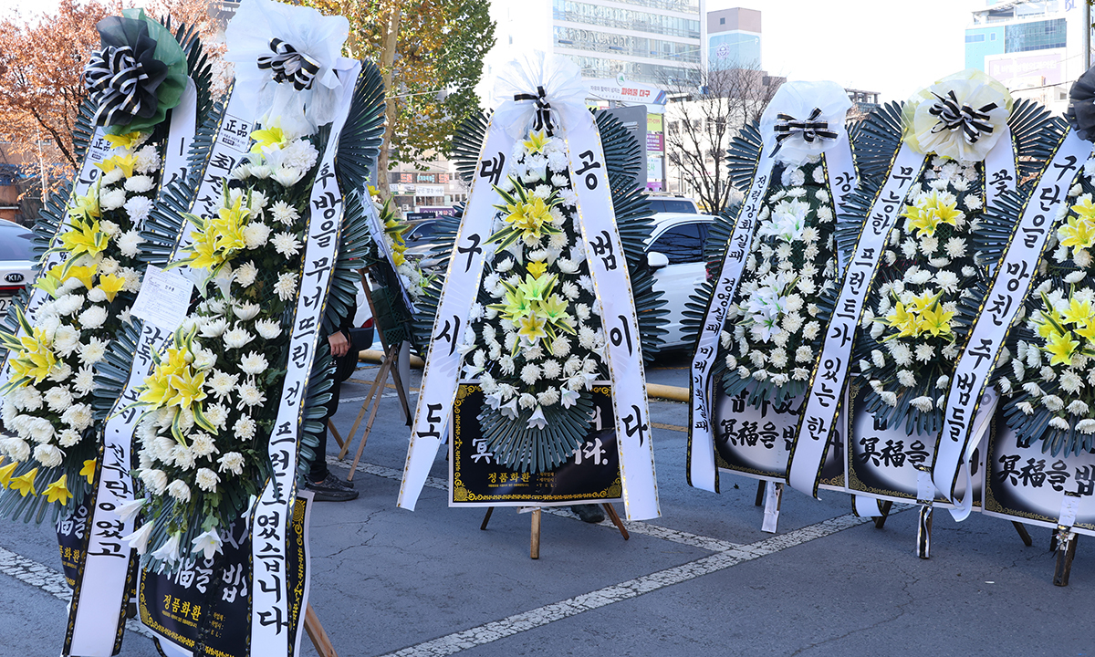 금조화환에는 ‘대구시의 잘못은 없나’, ‘지금 필요한 건 변명이 아니라 사과’ 등 항의성 메시지가 담겼다.