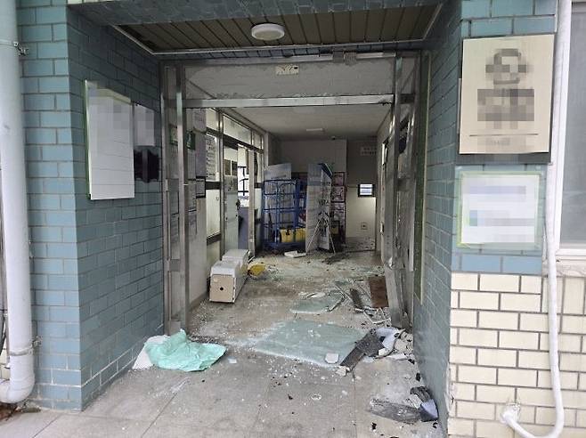 피의자 A씨가 차량으로 돌진해 파손된 관리사무소. 사진=SNS 갈무리
