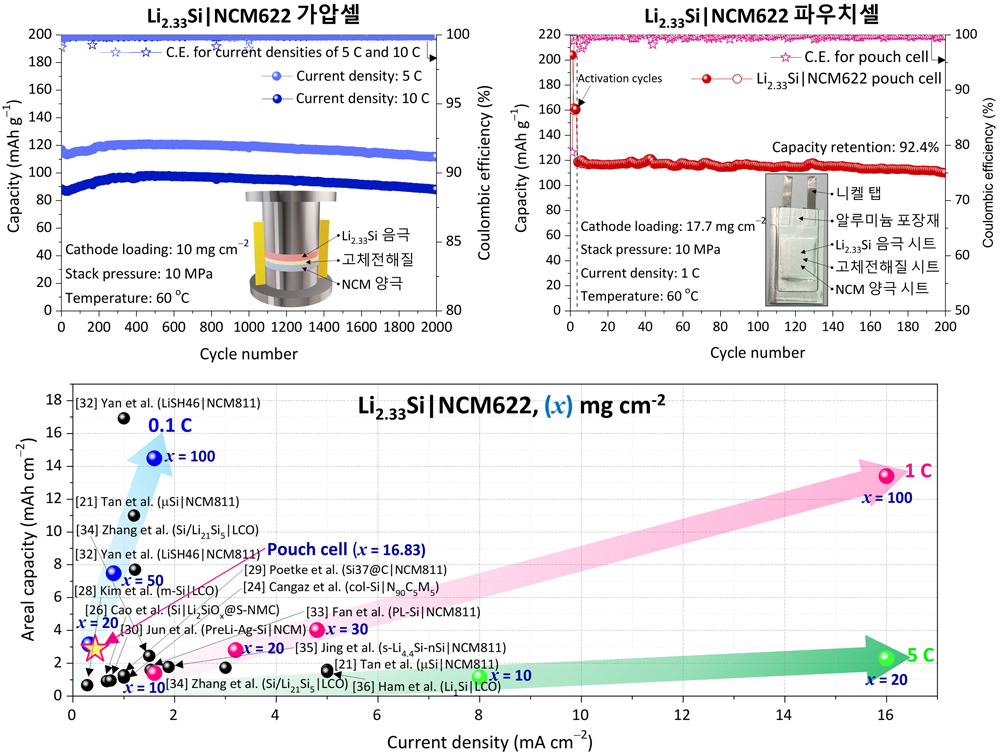 그러나 실리콘 음극은 충전 또는 방전 시 심각한 부피 팽창과 낮은 이온·전자 전도도, 고체전해질과의 부반응 등의 문제로 전고체전지 적용이 사실상 어렵다는 평가를 받아왔다. 연구팀은 ‘리튬·실리콘 화합물 기반의 완전히 새로운 음극 구조 설계’를 통해 모든 난제를 동시에 해결했다.