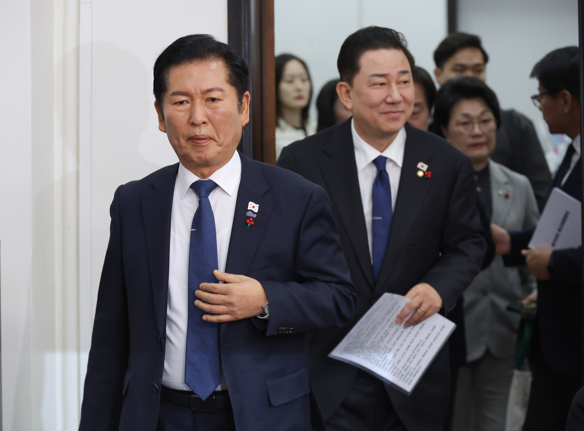 최고위원회의 입장하는 민주당 지도부 (서울=연합뉴스) 황광모 기자 = 더불어민주당 정청래 대표와 김병기 원내대표를 비롯한 당 지도부들이 8일 서울 여의도 국회에서 열린 최고위원회의에 입장하고 있다. 2025.12.8 hkmpooh@yna.co.kr/2025-12-08 09:42:12/ <저작권자 ⓒ 1980-2025 ㈜연합뉴스. 무단 전재 재배포 금지, AI 학습 및 활용 금지>