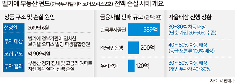이 펀드는 벨기에 정부 산하기관이 임차한 오피스건물을 기초자산으로 해 안정적인 수익을 낼 수 있다는 점을 내세워 판매됐다. 하지만 코로나19 확산과 유럽 부동산 경기 침체로 자산가치가 급락했다. 특히 현지 은행 대출을 선순위로 두고 펀드 자금을 후순위로 설정한 상품 설계 탓에, 2023년 말 선순위 대출 만기 연장이 무산되자 건물이 매각되는 과정에서 후순위 투자금이 전액 소진됐다.