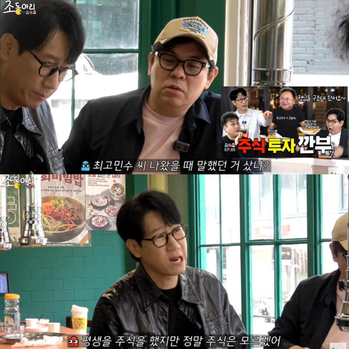 김용만은 “최고민수 씨 나왔을 때 말했던 거(주식) 샀냐?”고 운을 뗐다. 지석진은 “난 대화를 못할 정도다. 평생 주식을 했지만 정말 주식을 모르겠다”고 한탄했다. 김수용은 “요즘 뭐 주식 좋다고 말할때가 팔때야. 폭락할 때가 살때고”라고 말했다.