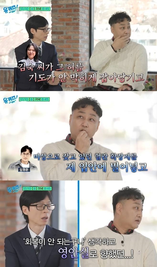 "내 혀가 막 말렸다고 하더라. 김숙씨가 기도가 안 막히도록 혀를 잡아당기고, 임형준씨가 비상으로 갖고 있던 응급혈관확장제를 내 입에 밀어 넣었다. 제세동기로 일곱번 CPR을 해도 (20분간) 심박이 돌아오지 않았다고 하더라. 회복이 안 되는구나 생각해 영안실로 향했다."