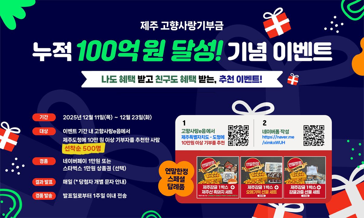제주도는 누적 100억 원 달성을 기념해 이날부터 23일까지 ‘기부자 추천 이벤트’를 진행한다.