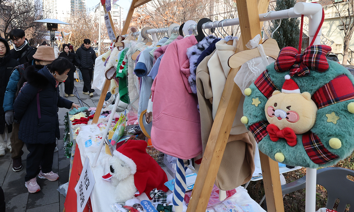14일 서울 노원구 공릉숲길에서 열린 제2회 ‘경춘선 공릉숲길 크리스마스 마켓’을 찾은 시민들이 부스에 진열된 크리스마스 관련 상품들을 살펴보고 있다.