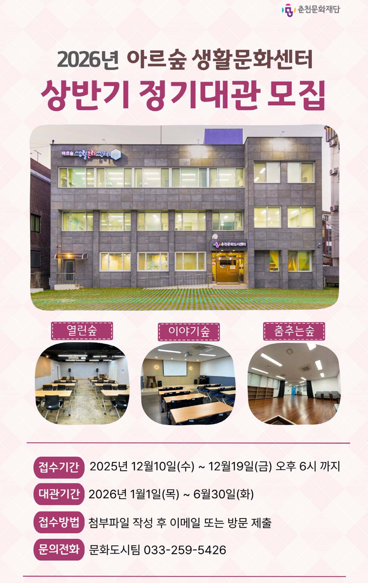 춘천문화재단이 2026년 상반기 시민 생활문화 활동을 지원하기 위해 ‘아르숲 생활문화센터 정기대관’ 이용자를 모집한다고 15일 밝혔다.
