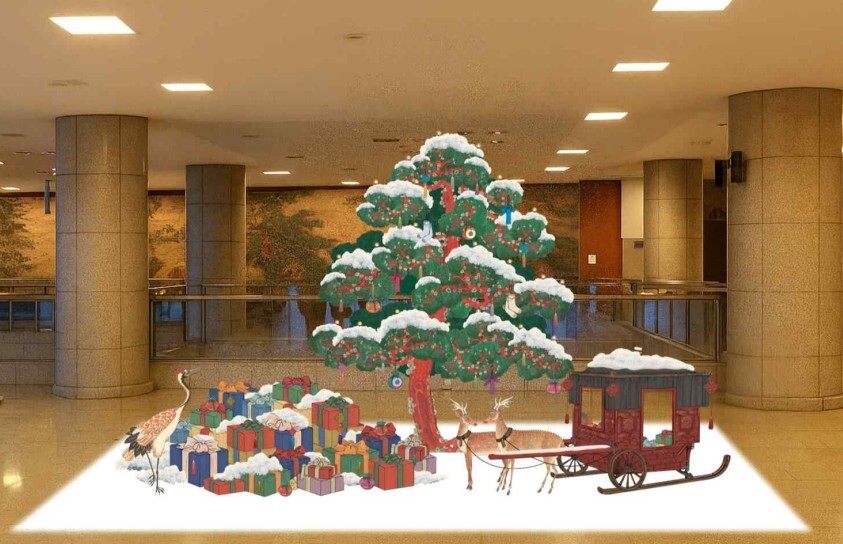 트리 앞에는 루돌프 대신 코가 빨갛게 물든 ‘사슴’과 서양식 썰매 대신 임금이 타던 가마인 ‘가교(駕轎)’를 배치해 해학을 더했다. 주변에는 전통 보자기로 포장된 선물 상자와 이를 지켜보는 학 모형을 두어 십장생도 속 불로장생의 기운과 연말의 풍성함을 동시에 표현했다.