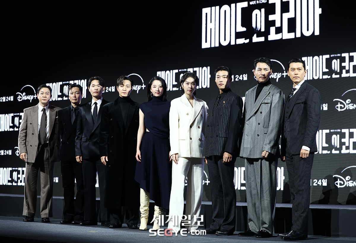 배우 정우성(사진 왼쪽)과 현빈이 15일 서울 강남구 삼성동 그랜드 인터컨티넨탈 서울 파르나스에서 열린 디즈니+의 오리지널 시리즈 ’메이드 인 코리아’의 제작발표회에 참석해 포즈를 취하고 있다.