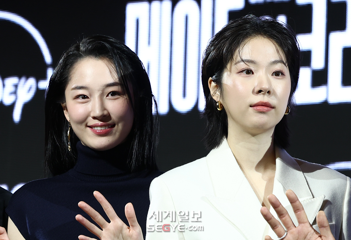 배우 원지안(사진 왼쪽)과 서은수가 15일 서울 강남구 삼성동 그랜드 인터컨티넨탈 서울 파르나스에서 열린 디즈니+의 오리지널 시리즈 ’메이드 인 코리아’의 제작발표회에 참석해 포즈를 취하고 있다.
