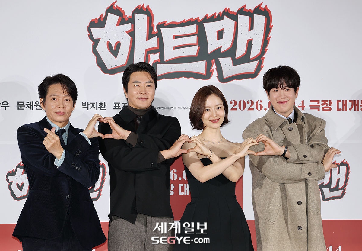 배우 박지환, 권상우, 문채원, 피오(사진 왼쪽부터)가 15일 서울 광진구 롯데시네마 건대입구에서 열린 영화 ‘하트맨’ 제작보고회에 참석해 포즈를 취하고 있다.
