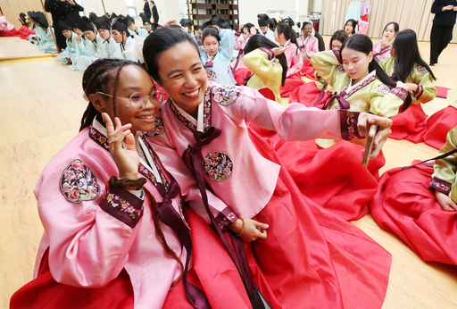 15일 부산 동래구 충렬사 안락서원에서 동서대 외국어교육원 한국어 연수과정 외국인 학생들이 예절교육에 앞서 한복을 차려입고 기념사진을 찍고 있다.
