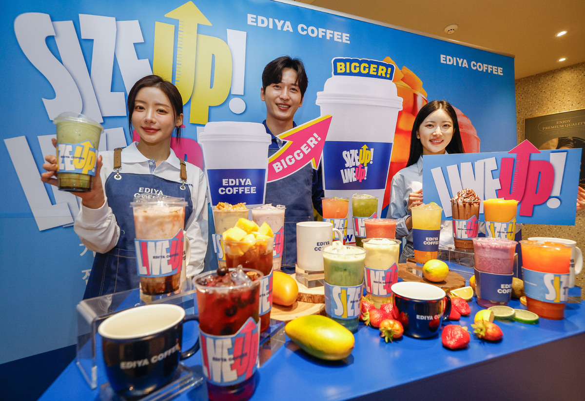 이디야커피가 16일 서울 중구 이디야커피 매장에서 음료 용량 확대 및 메뉴 라인업 개편을 알리는 'SIZE UP & LINE UP' 행사를 하고 있다. 이번 개편을 통해 이디야커피는 음료 사이즈 체계를 라지(L), 엑스트라라지(EX) 기준으로 통일하고 기존 14온스 중심의 운영 기준을 18온스 기반으로 정비했다.