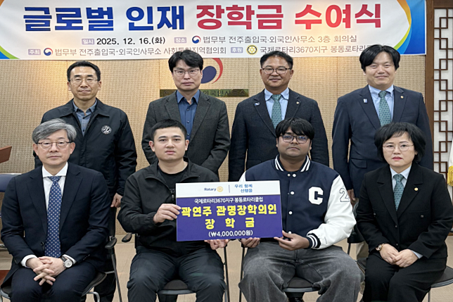 전주출입국·외국인사무소 사회통합지역협의회가 관내 우수 외국인 유학생을 대상으로 글로벌 인재 장학금을 전달하며 학업 지원과 사회통합에 힘을 보탰다.