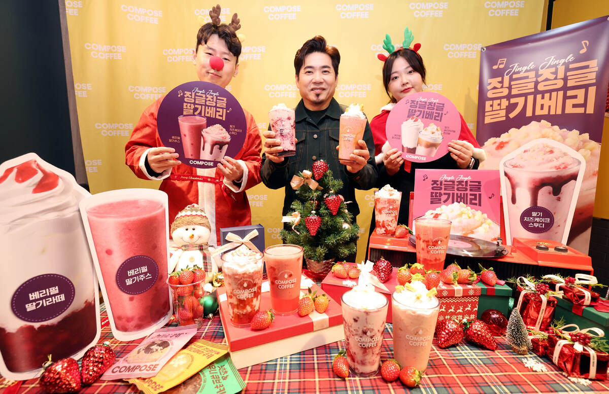 16일 서울 종로구 컴포즈커피 종로6가점에서 가수 김조한과 모델들이 컴포즈커피 겨울 신메뉴 딸기 음료와 쿠키를 선보이고 있다.