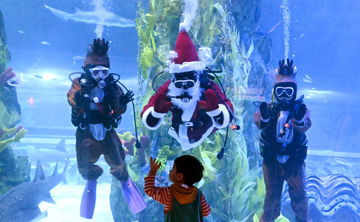크리스마스를 앞둔 16일 서울 송파구 롯데월드 아쿠아리움 메인수조에서 산타와 루돌프로 변신한 아쿠아리스트가 수중 퍼포먼스를 선보이고 있다.