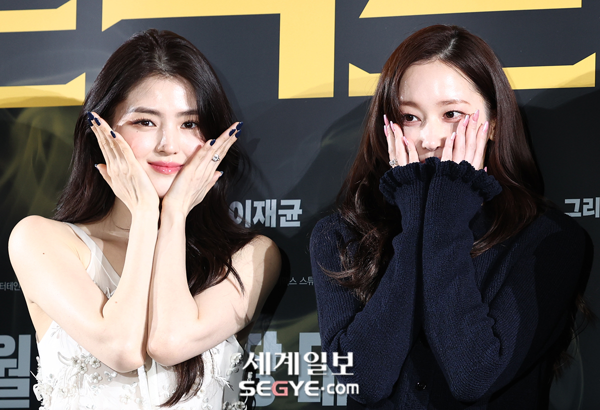 배우 한소희(사진 왼쪽)와 전종서가 16일 서울 강남구 삼성동 메가박스 코엑스에서 열린 영화 ’프로젝트 Y’의 제작보고회에 참석해 포즈를 취하고 있다.