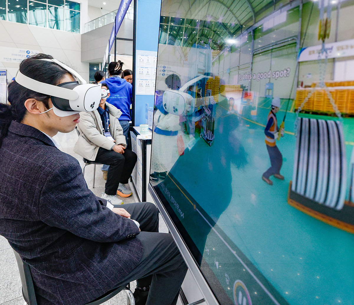 16일 경기 고양시 일산서구 킨텍스에서 열린 ‘2025국제노동페스타’에서 시민들이 산업안전 VR체험을 하고 있다. 이 행사에서는 국내 최초로 중앙·지방정부, 국제기구가 청년과 함께 ‘괜찮은 일자리’와 ‘일의 미래’를 논의한다.