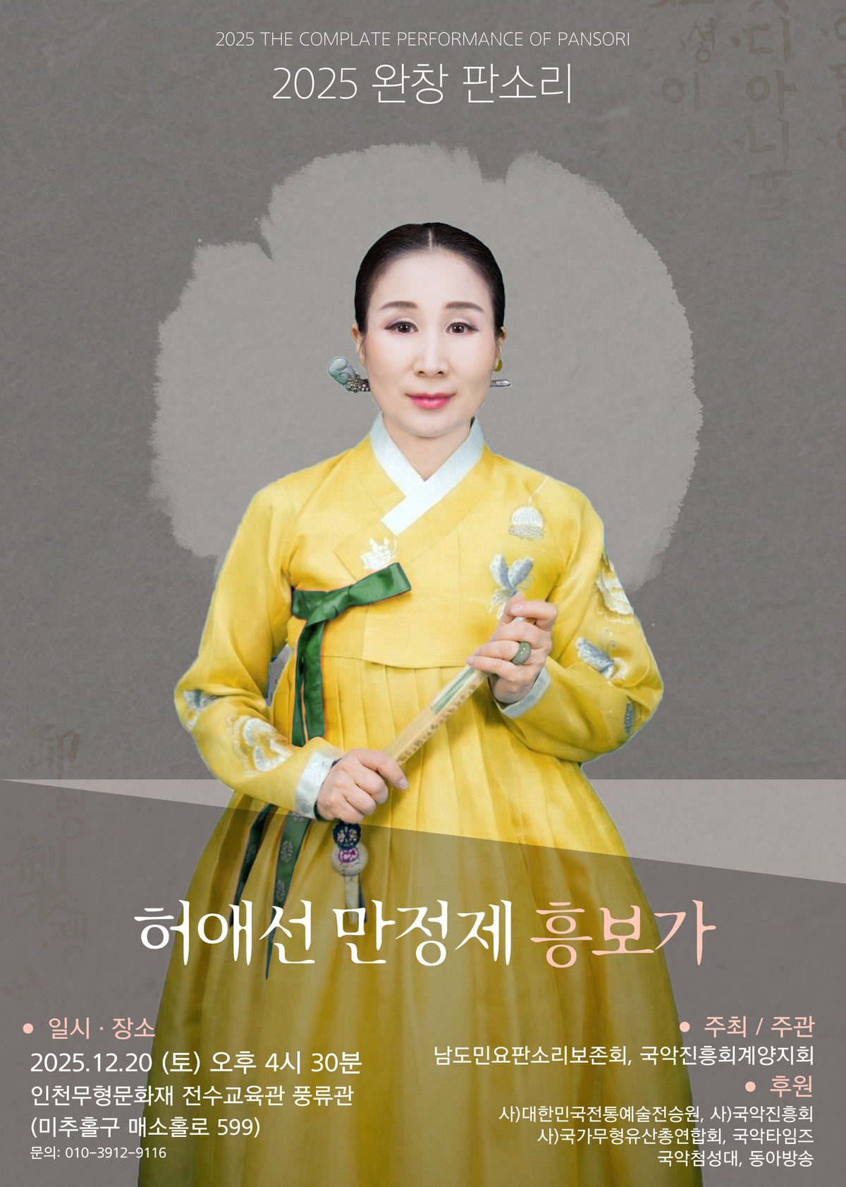 2025 완창 판소리, 허애선의 만정제 흥보가 무대가 20일 오후 4시30분 인천시 미추홀구 매소홀로 인천무형유산교육전수관 풍류관에서 펼쳐진다.