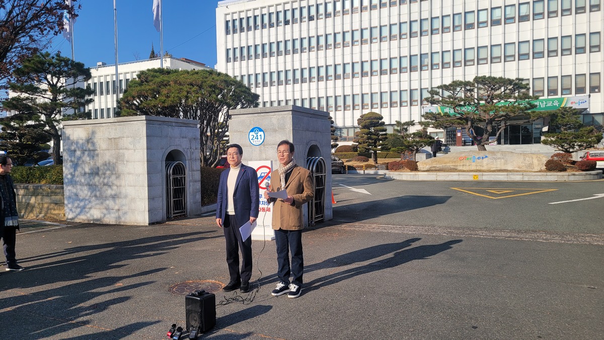 17일 연대 등에 따르면 보수‧중도 경남교육감 출마 예정자인 김영곤 전 교육부 차관보와 김상권 전 경남교육청 교육국장은 지난 16일 경남교육청 앞에서 긴급 공동 기자회견을 열고 “연대가 진행한 여론조사 결과의 공표와 관리 과정 전반에 중대한 문제가 발생했다”고 지적했다.