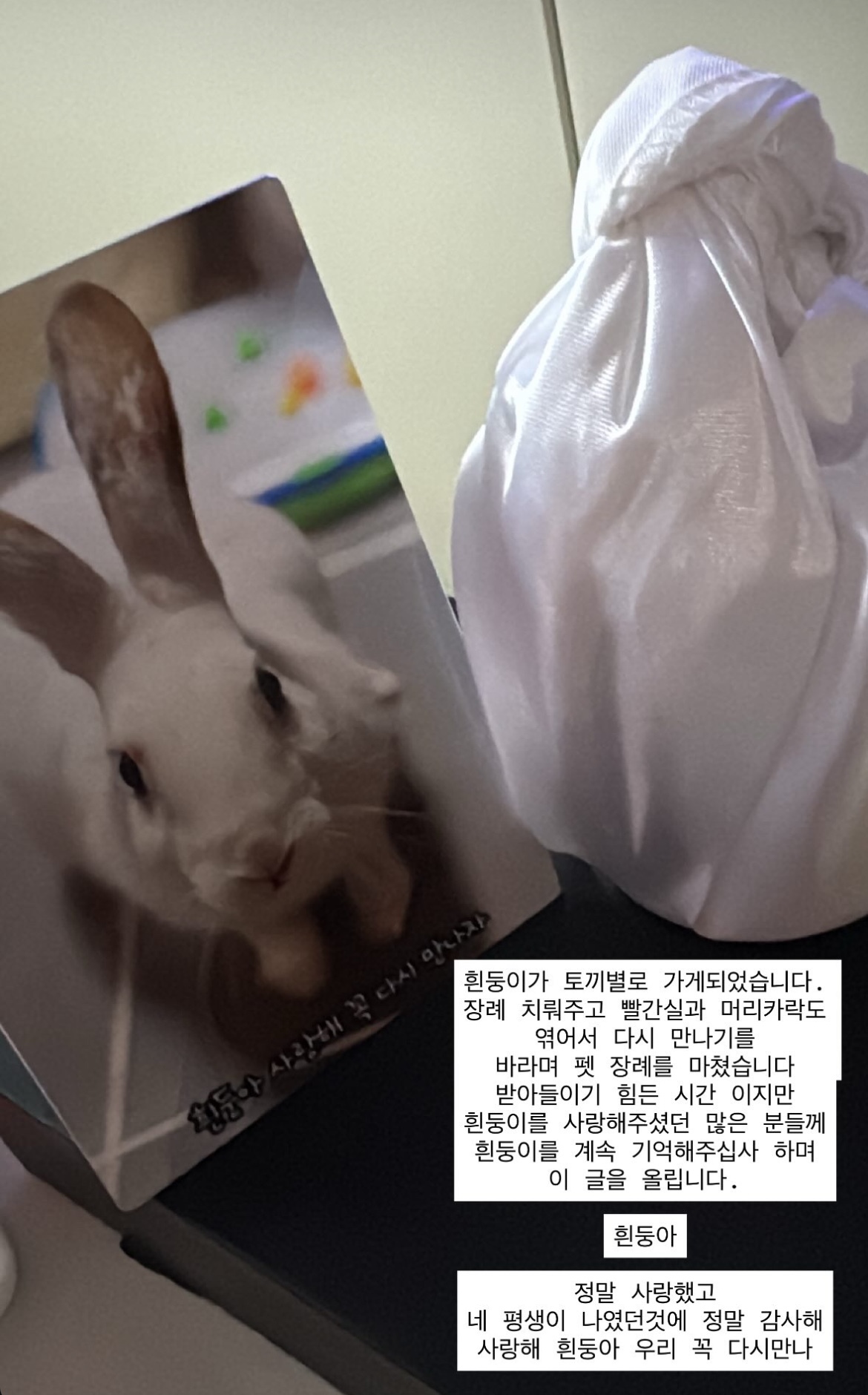 그는 ‘받아들이기 힘든 시간이지만 흰둥이를 사랑해주셨던 많은 분들께 흰둥이를 계속 기억해 주십사 하며 이 글을 올립니다’라고 소식을 전하게 된 이유를 밝혔다.