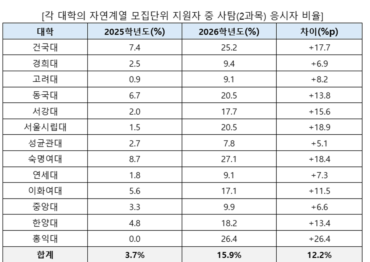 진학사가 사탐 응시자가 자연계열 모집단위에 지원할 수 있는 서울 대학 중 13개교를 분석한 결과, 자연계열에 지원한 수험생 중 사탐 2과목 응시자 비율은 2025학년도 3.7%에서 2026학년도 15.9%로 12.2%포인트 증가했다. 사탐과 과탐을 함께 응시한 수험생까지 포함하면 전년도 9.6%에서 올해 40.3%까지 늘었다.