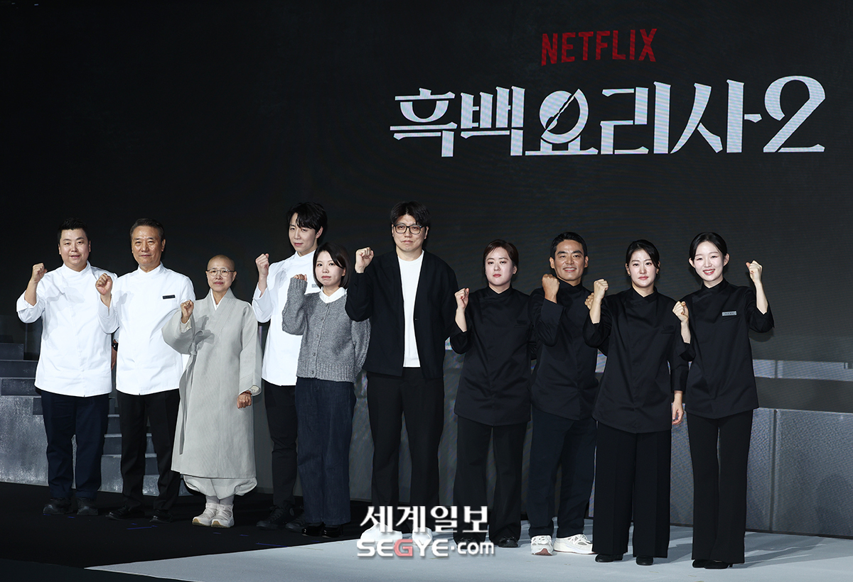 정호영, 후덕죽, 선재스님, 손종원, 김은지 PD, 김학민 PD, 술 빚는 윤주모, 프렌치 파파, 중식 마녀, 아기 맹수(사진 왼쪽부터)가 17일 서울 중구 JW 메리어트 동대문 스퀘어 서울에서 넷플릭스 예능 '흑백요리사: 요리 계급 전쟁2' 기자간담회 참석해 포즈를 취하고 있다.