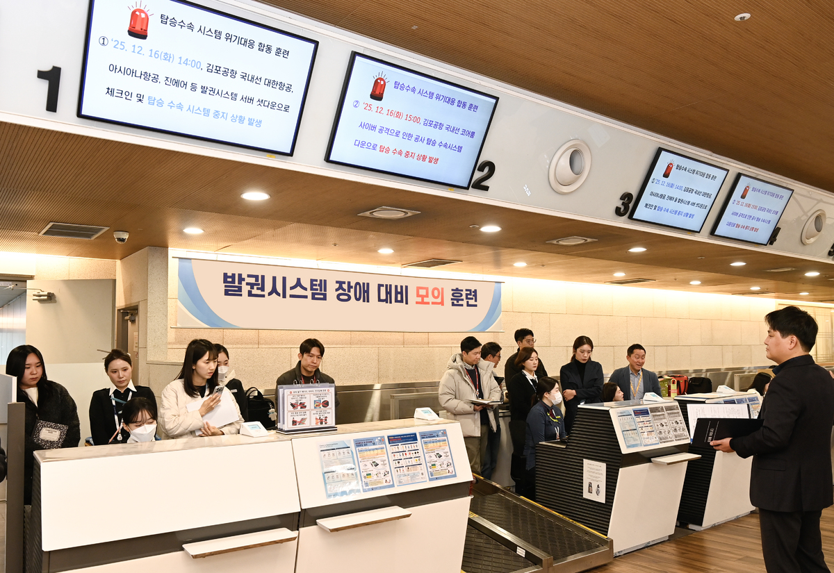 한국공항공사는 16일부터 이틀 간 김포공항 국내선터미널에서 자체 개발한 ‘간이 여객처리 시스템(L-DCS)’을 활용해 항공사 발권시스템 장애 상황 대비 모의훈련을 실시했다.