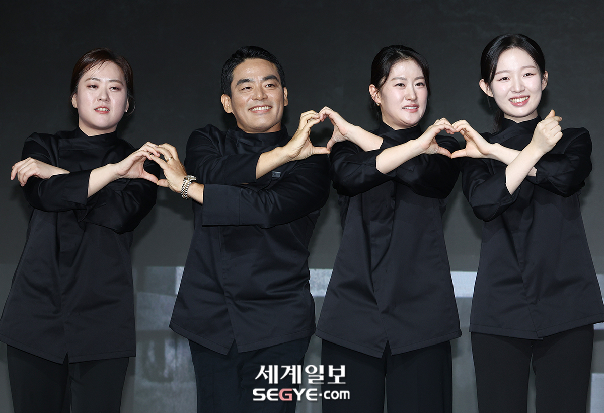 술 빚는 윤주모, 프렌치 파파, 중식 마녀, 아기 맹수(사진 왼쪽부터)가 17일 서울 중구 JW 메리어트 동대문 스퀘어 서울에서 넷플릭스 예능 '흑백요리사: 요리 계급 전쟁2' 기자간담회 참석해 포즈를 취하고 있다.