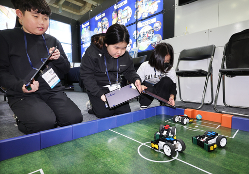17일 부산 해운대구 벡스코 2전시장에서 열린 ‘2025 부산 디지털 교육 페스타’에서 학생들이 로봇으로 축구경기를 하고 있다. 18일까지 이틀간 열리는 이번 행사에서는 디지털 기반 교육 관련 5개 영역, 18주제, 34개 부스가 운영된다.