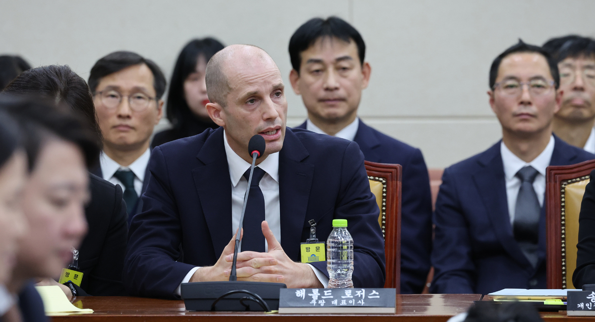 해럴드 로저스 쿠팡 대표이사(가운데)가 17일 서울 여의도 국회에서 열린 과학기술정보방송통신위원회의 쿠팡 개인정보 유출사태 관련 청문회에서 의원 질의에 답변하고 있다.