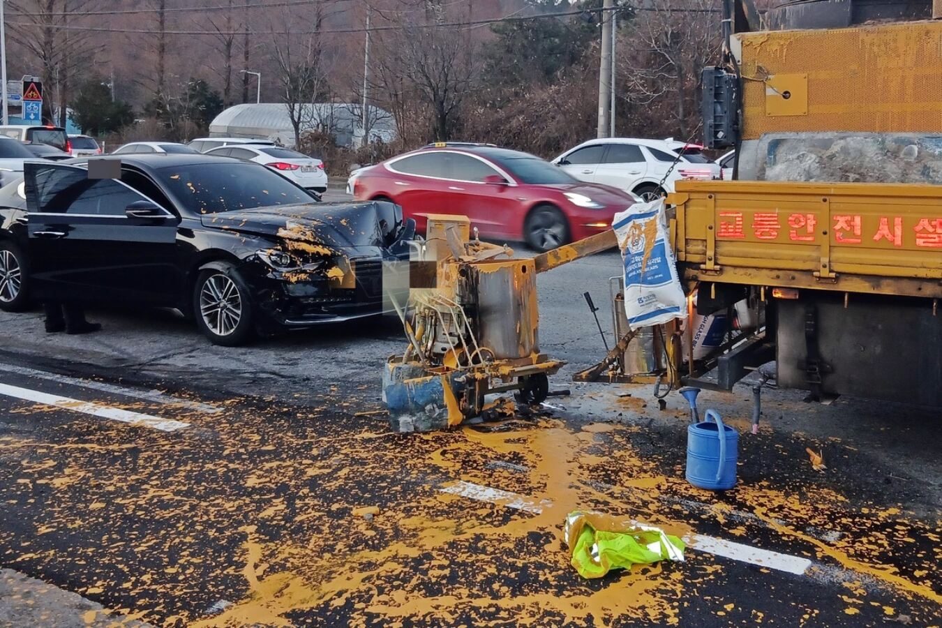 18일 전북도소방본부와 경찰에 따르면 전날 오후 4시55분쯤 전주시 완산구 상림동 한 도로에서 그랜저 승용차가 2.5t 노면 도색 차량을 들이받았다. 이 사고로 도색 차량에 실려 있던 고온의 도료가 터지면서 주변에서 작업 중이던 작업자 3명이 화상을 입고 병원으로 이송됐다.