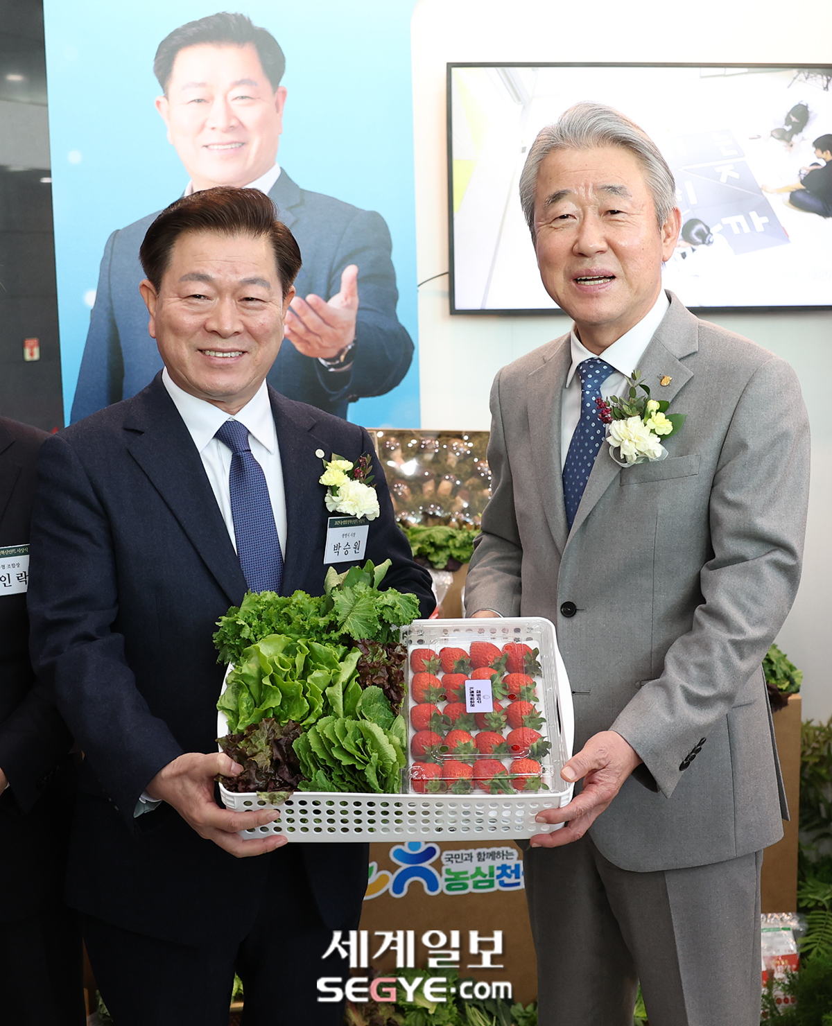 박승원 경기 광명시장(사진 왼쪽)과 강호동 농협중앙회장과18일 서울 중구 농협 본관에서 진행된 ‘2025 농업발전혁신인상(像)’ 행사에 참석해 기념촬영을 하고 있다.