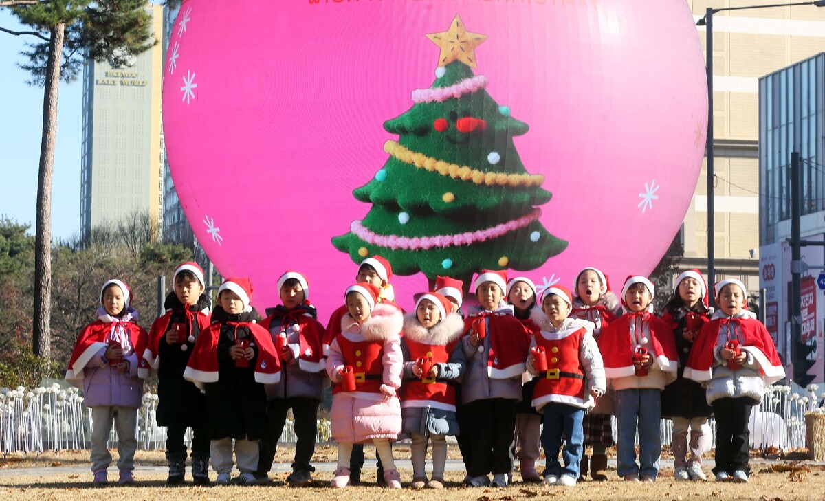 산타 복장을 차려입은 송파구청 어린이집 원생들이 18일 서울 송파구 석촌호수 더 스피어 앞에서 뛰어 놀고 있다. 송파구는 연말연시를 맞아 더 스피어를 통해 크리스마스와 새해를 주제로 한 미디어아트를 상영한다.