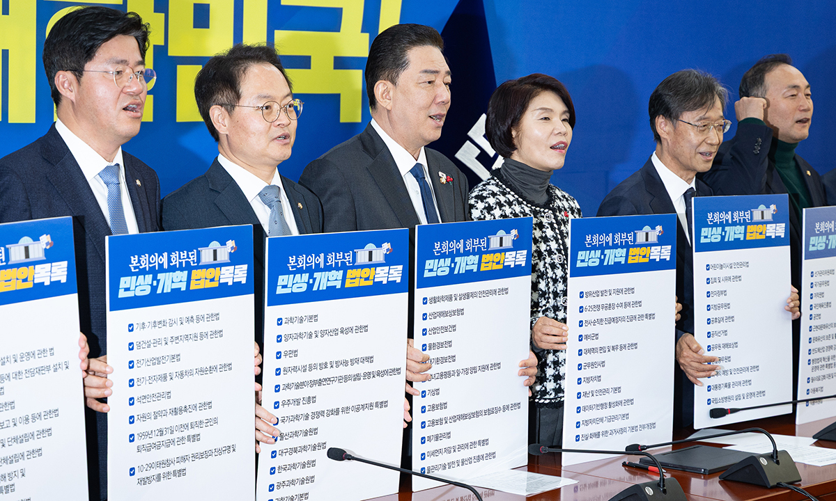 더불어민주당 김병기 원내대표를 비롯한 원내지도부가 18일 서울 여의도 국회에서 열린 정책조정회의에 앞서 본회의에 회부된 민생·개혁 법안목록이 적힌 손팻말을 들고 국민의힘이 법안 처리에 협조할 것을 요구하고 있다. 왼쪽부터 박상혁 원내소통수석부대표, 허영 원내정책수석부대표, 김 원내대표, 한정애 정책위의장, 유동수 정책수석부대표, 김원이 의원.