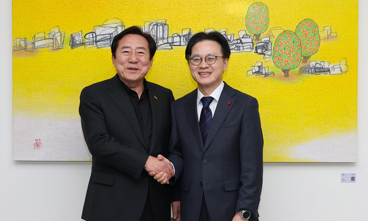 중소기업중앙회는 18일 서울 여의도 중기중앙회에서 김정관 산업통상부 장관과 중소기업계 산업·통상 현안을 논의했다고 밝혔다. 중기중앙회 측은 중소기업 위기 요인으로 중국 저가 제품의 공세와 중국 기술의 부상, 국내 인건비·원자재 가격 상승 등을 꼽으며 뿌리 산업에 대한 지원강화와 대·중소기업 상생 생태계 마련 등을 김 장관에게 요청했다. 사진은 김 장관(오른쪽)과 김기문 중기중앙회장이 악수하며 기념 촬영을 하는 모습.