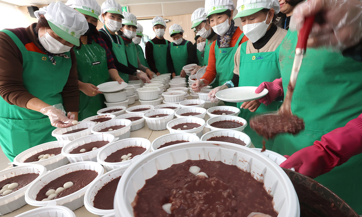 동지를 나흘 앞둔 18일 인천 미추홀구 용현1·4동 행정복지센터에서 새마을부녀회원들이 취약계층 어르신들에게 전달할 동지팥죽과 김치를 포장하고 있다.