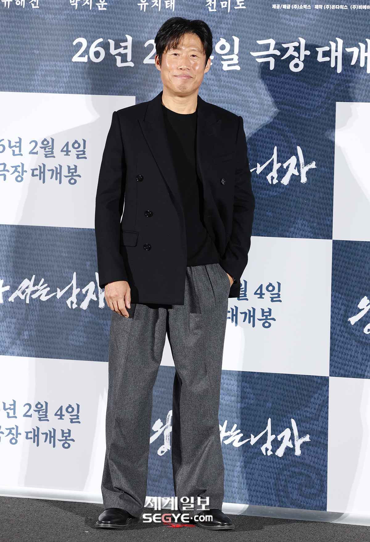 배우 유해진이 19일 서울 용산구 용산 CGV아이파크몰점에서 열린 영화 '왕과 사는 남자' 제작보고회에 참석해 포즈를 취하고 있다.