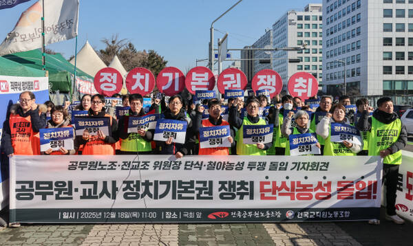 20일 전교조 등에 따르면 전교조는 전국공무원노동조합과 18일부터 국회 앞에서 단식과 철야 농성을 진행 중이다. 이들은 “국회는 교사·공무원의 정치활동을 금지하는 법률 조항을 즉시 개정하고, 정부와 여당은 정치기본권을 보장한다는 대선·총선에서의 약속을 즉각 이행하라”고 목소리를 높였다. 전교조의 단식투쟁은 2018년 법외노조 취소 투쟁 이후 7년 만이다.